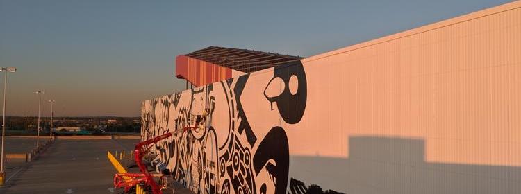 The exterior of the slope, which was criticised whilst it stood dormant for a garish orange paint job, is now being reworked with a huge black on white mural being created which is being promoted as set to be the largest public art work in eastern North America.