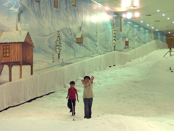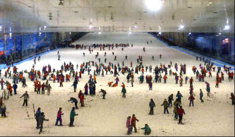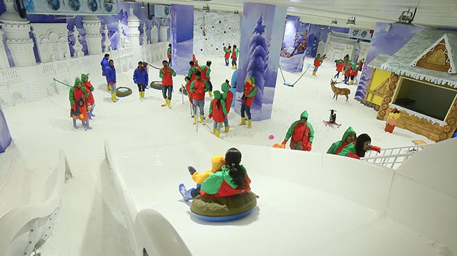 The Imagica Snow Park in Western India offers a wide range of indoor activities on snow including playing basketball, a toboggan slope, “climbing the rocky snowy mountains,” snow rafting and snowball fights. There is also a dance floor, snow castle, ice igloo and its sculptures.