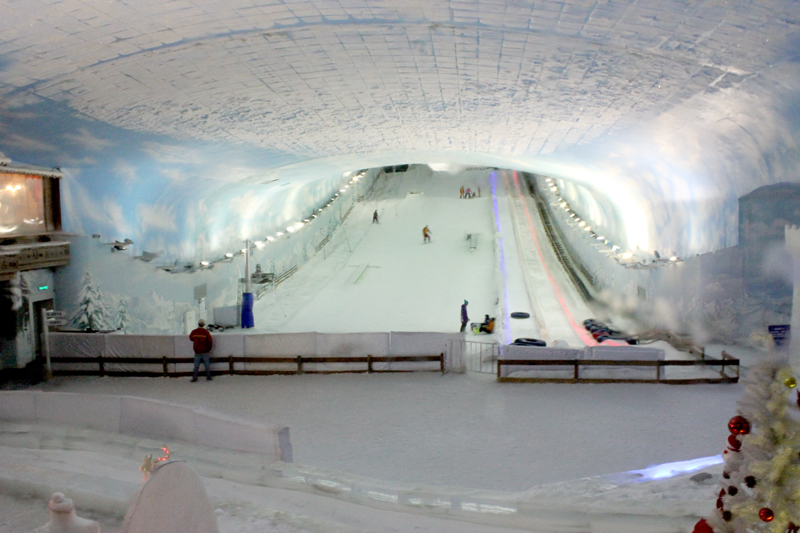 Mumbai’s Snow World opened in 2012 at Phoenix Marketcity shopping mall and combines snow and ice features made of plastic, such as the giant snowballs at the entrance to the facility on the ground floor of the mall and an igloo shaped structure, and in a separate snow experience section real snow 30cm deep. There is also an ice rink, a sledge “pulled by employees” and snow slides.