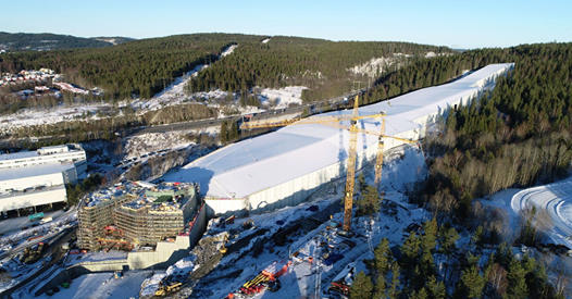 The concept for this centre in Lorensburg, close to Oslo, was first envisaged in 2010. With 36,000 square metres of year-round snow covered slopes it is Europe’s largest by area although the 505m long slope is a little shorter than existing slopes in France and Germany. However the 100m slope width served by five lifts gives a huge indoor snow area. Along with the downhill slopes the complex includes an indoor ski jump and indoor cross-country ski track capable of use by 1000 people at a time.